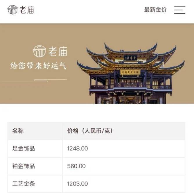 老庙黄金今日金饰价格1248元/克,较昨日1235元/克上涨13元/克。