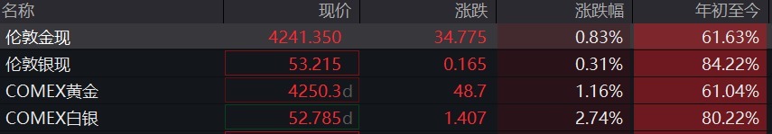 贵金属价格继续冲高,截至发稿COMEX黄金期货报4250.3美元/盎司,现货黄金报4241.35美元/盎司。